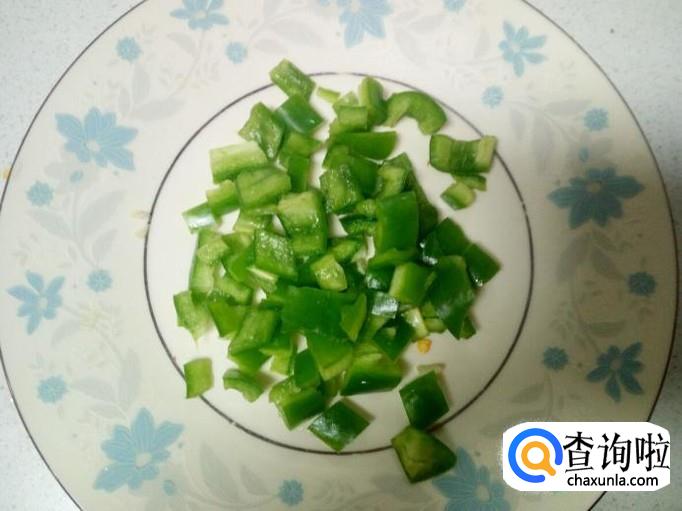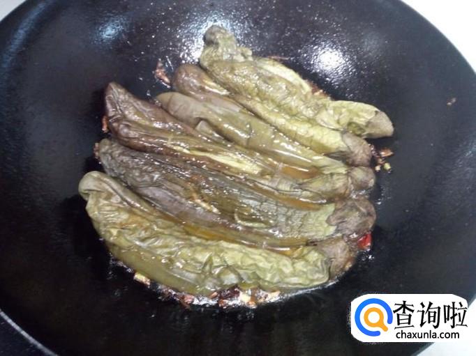 放入青尖椒稍翻炒一下,然后放入蒸熟的茄子。