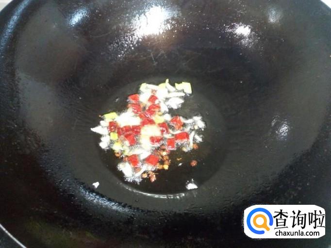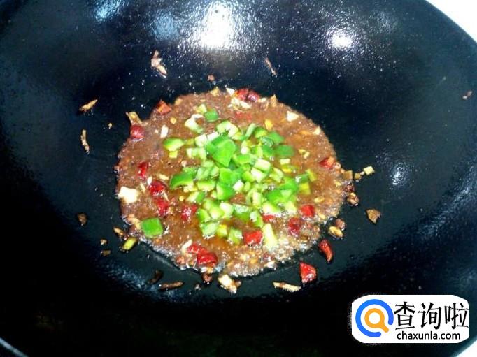 锅内放入油加热,油不要太多,油热后放入花椒,红干椒,葱,姜,爆香。放入两匙儿豆酱翻炒。
