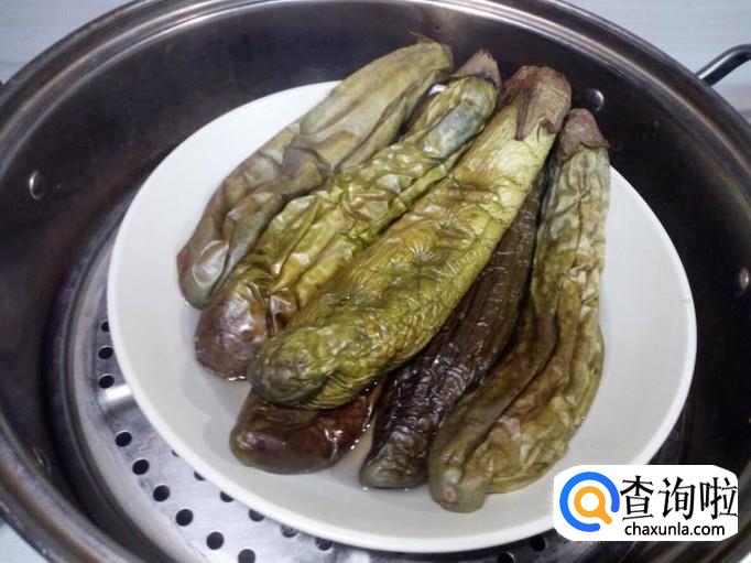 茄子去把(茄子蒂可去可留),清洗干净,控干水分。然后把茄子上锅蒸熟,大约蒸20~25分钟左右的时间,用筷子可以插透。