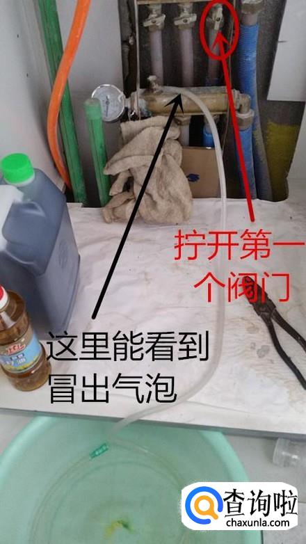 拧松排气阀门,然后拧开第一个进水阀,这时看到有水和气泡流出