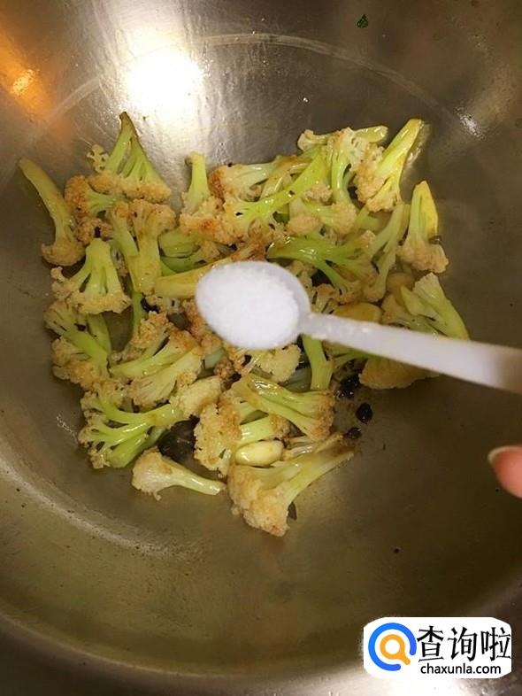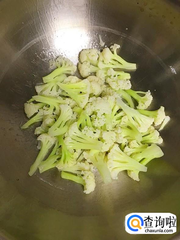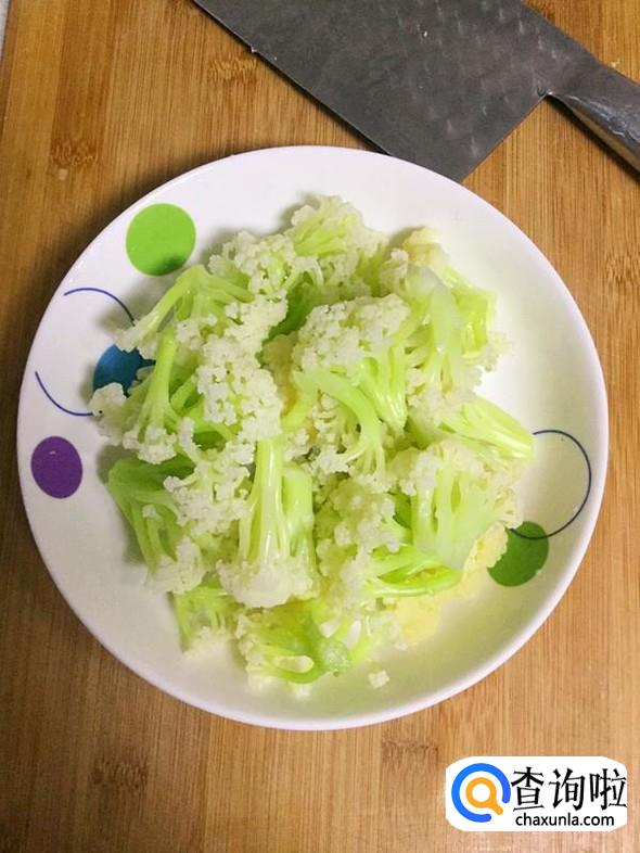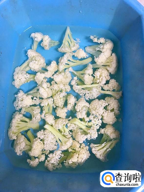 花菜掰成小朵,冲洗干净后放入淡盐水中浸泡5分钟左右。