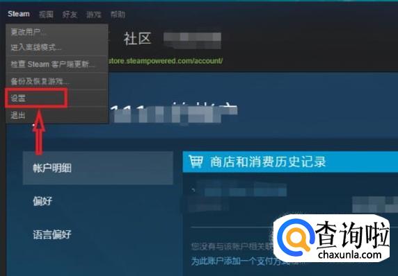 点击右上角steam,出现新的界面,点击“设置”