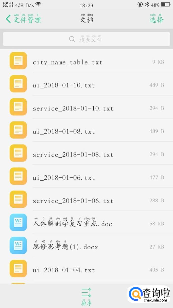 方法二:点击上面的小图标,根据自己要删除的文件类型来删除,比如我要删除多余的文档,那就点击文档的图标,进入,就可以看到我手机中的文档并进行清理了。