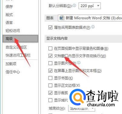 接着再点击高级,然后找到右侧处的文档窗口内显示文字自动换行功能,直接点击这个就不会在复制时自动换行了。