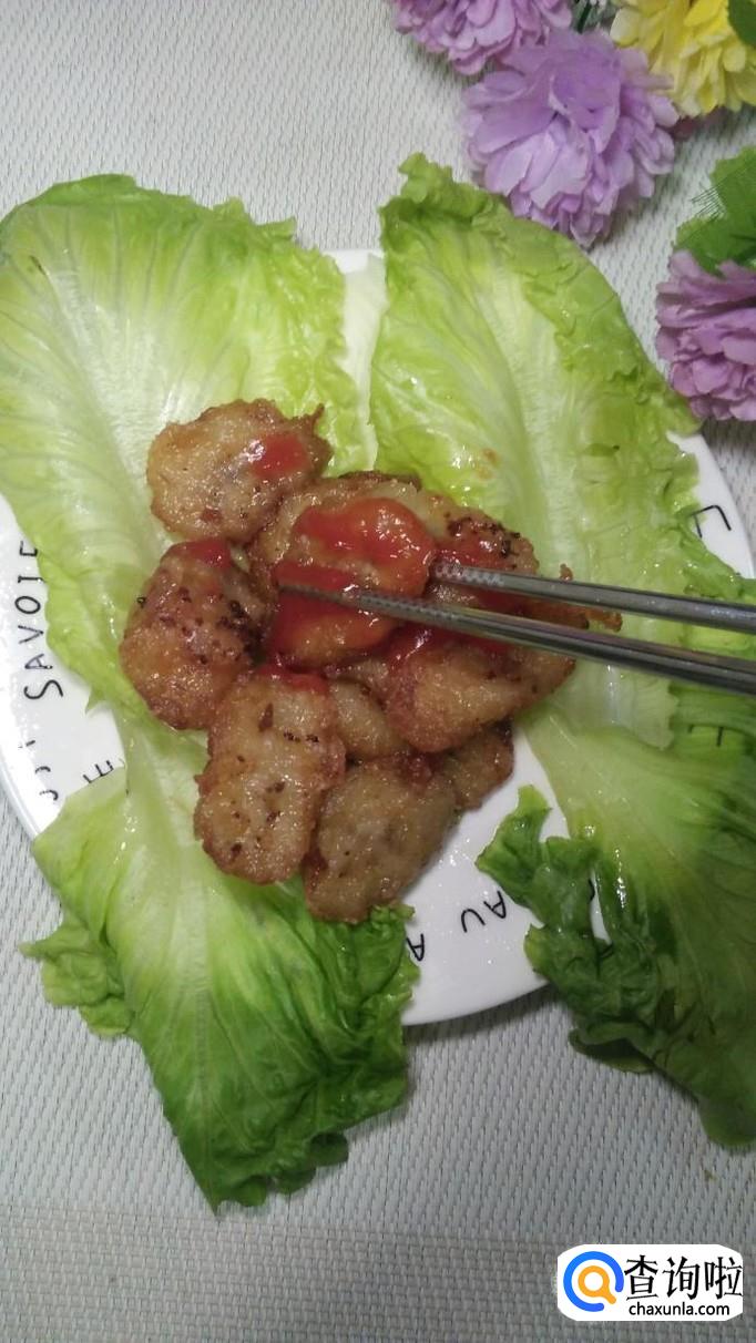 可以在盘子外侧摆上几片生菜,然后在炸好的香蕉上面挤上番茄酱,蘸酱吃,味道更独特,小孩子特别喜欢。