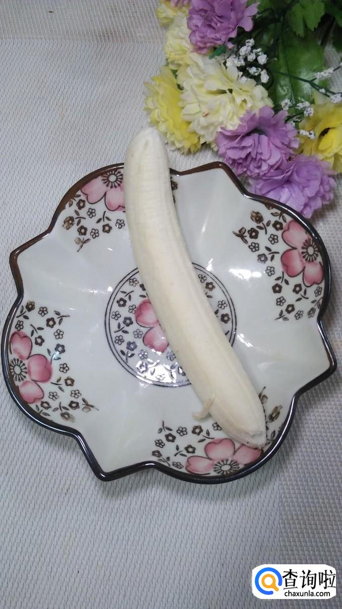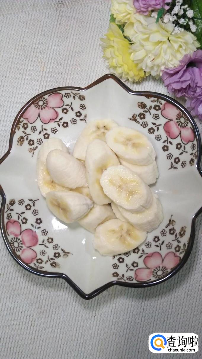 准备一根香蕉,将香蕉去皮后切成块,放入盘中备用,香蕉块儿不要切得太薄,适当厚一点儿就可以了。