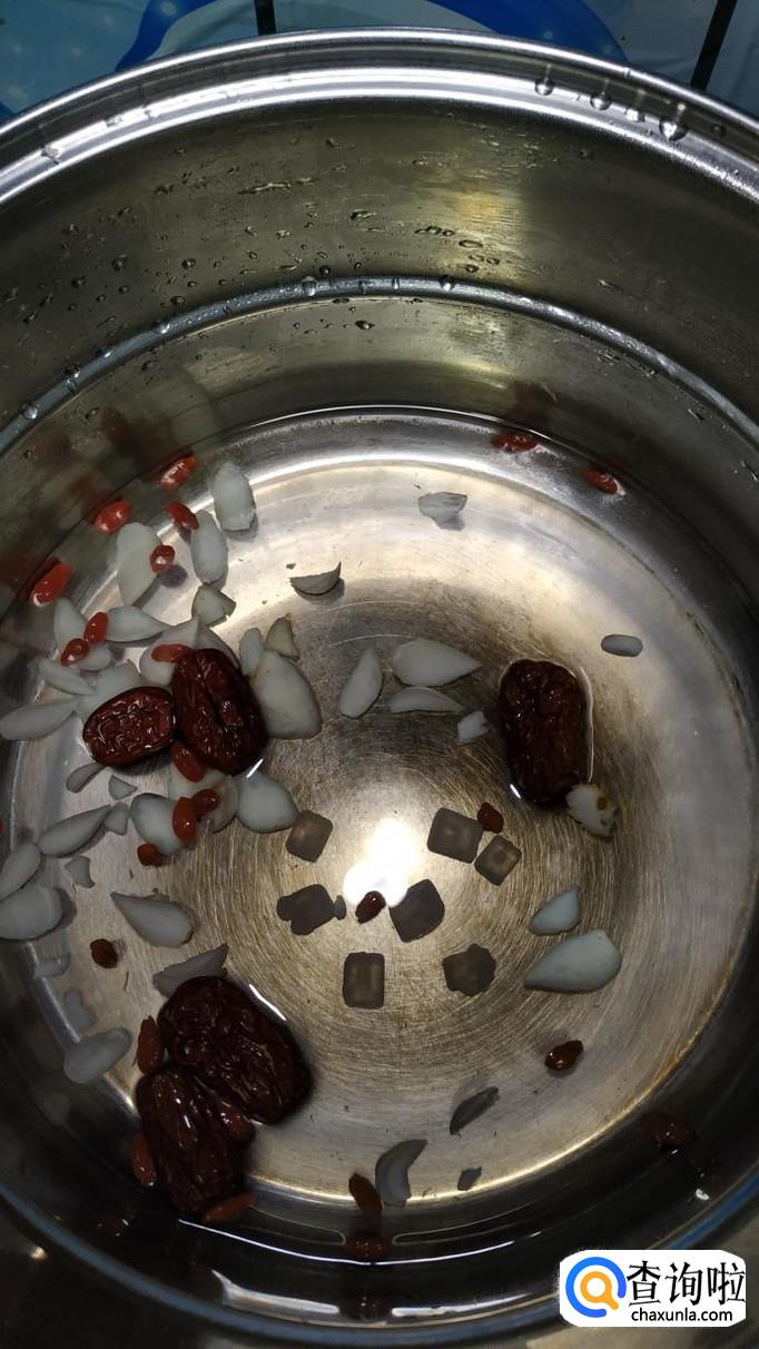 汤锅中放入适量清水,先将百合倒入锅中,再将泡好的枸杞子和红枣也倒入锅中。