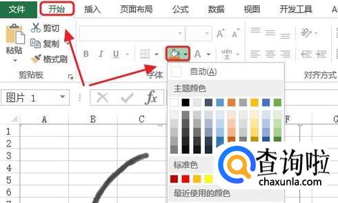然后返回到“开始”选项,找到填充颜色图标,我们从中选择任意一款自己需要的背景色填充即可,如图二...