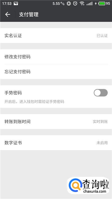 进入支付管理界面,将“手势密码”右侧滑块开启。