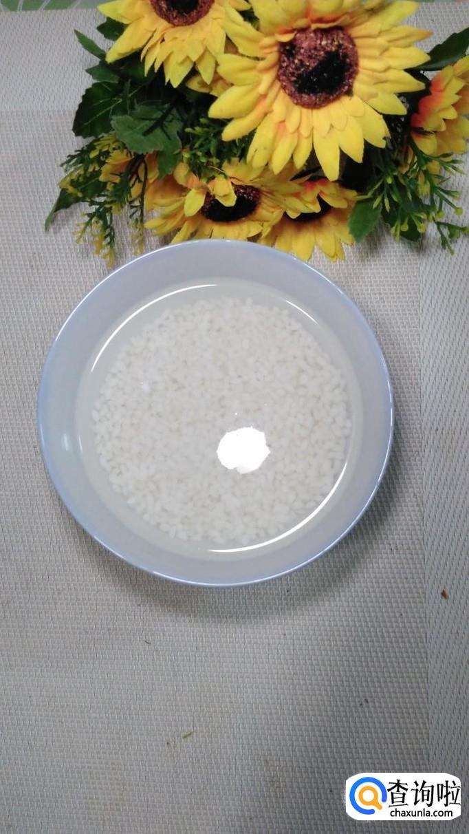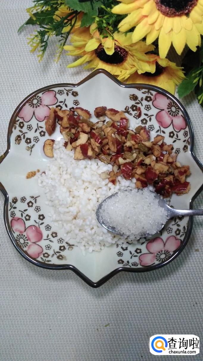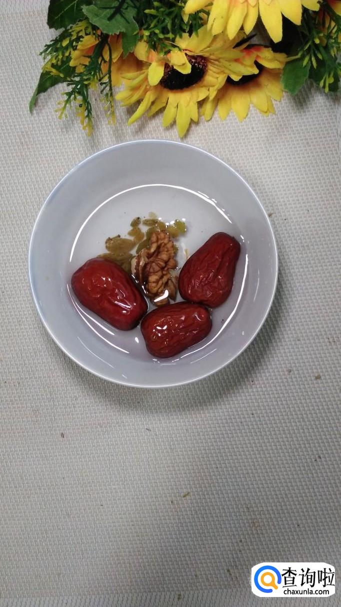 准备适量糯米,提前用清水泡四个小时以上,再准备适量大枣,核桃仁儿,葡萄干儿,用清水洗净,泡一下。