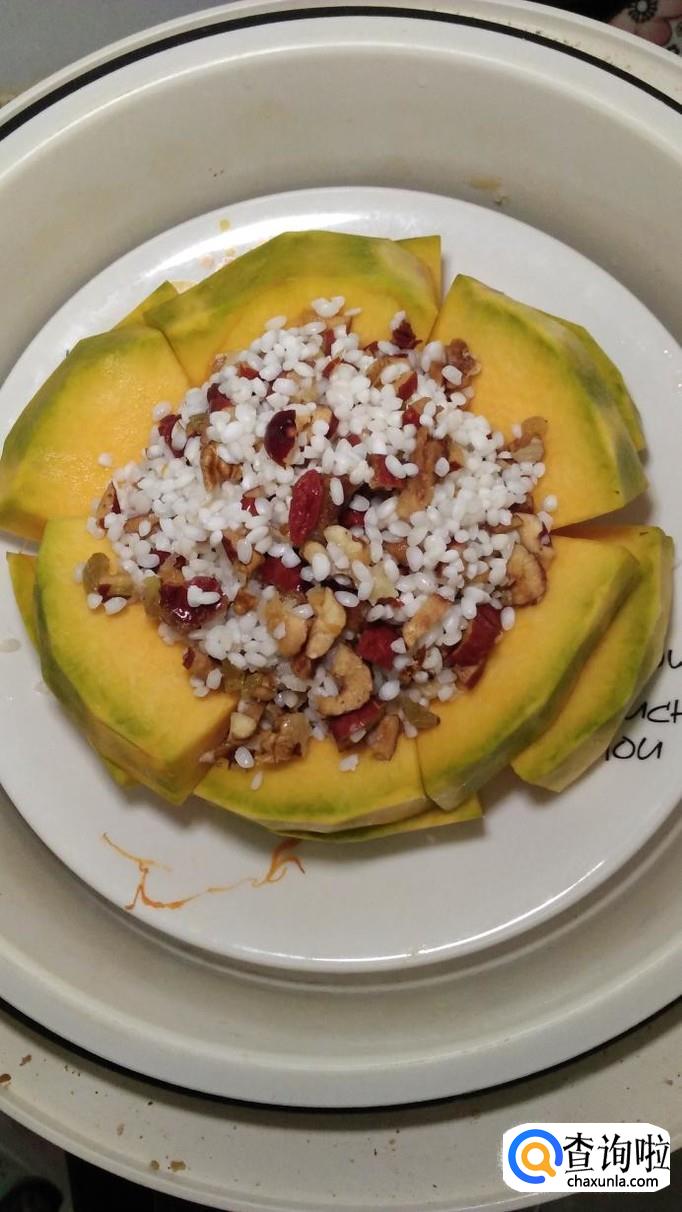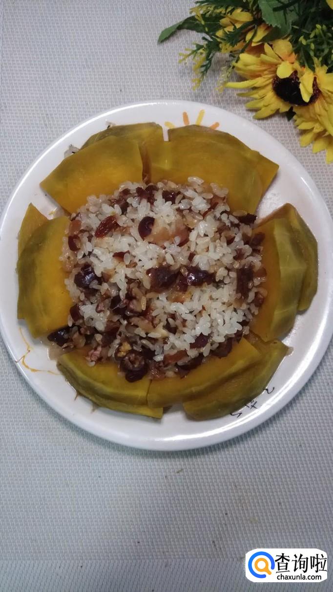 南瓜适量,糯米适量,大枣适量,葡萄干适量,核桃仁适量,白砂糖适量。