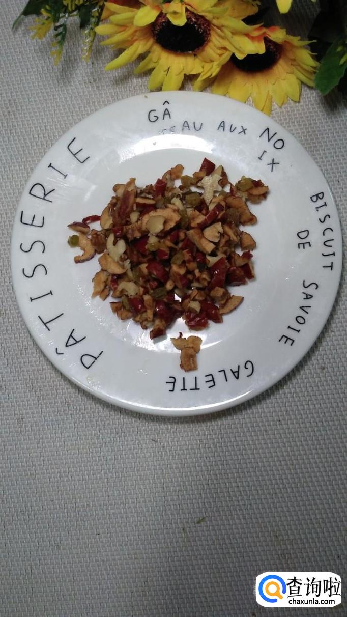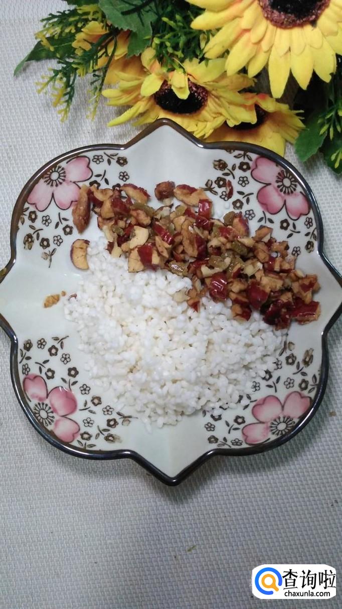 将泡好的大枣去核,然后和核桃仁,葡萄干儿一起用刀切碎,然后和泡好的糯米放在一起备用。