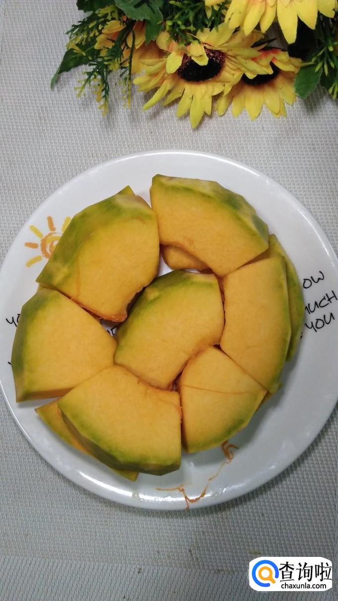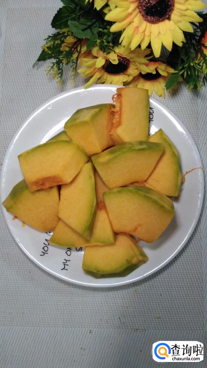 准备适量南瓜,洗净去皮后,切成大块,放入盘中备用。