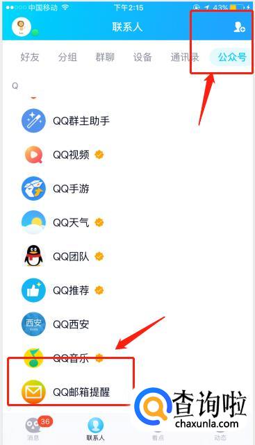在联系人页面,点击【公众号】,找到QQ邮箱提醒,然后点击。