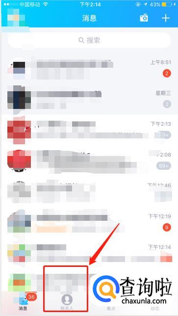 打开手机QQ,点击页面下方的【联系人】,进入联系人页面。