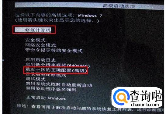 开机后按功能键F8进入“高级启动选项”,在下方的菜单栏中选择“最近一次的正确配置”或者“最后一次的正确配置”这个选项并回车即可。