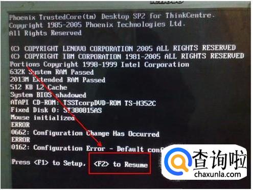 英文的最下面一行提示有功能键,如F2 toResume表示的就是重启,此时按下F2键即可。