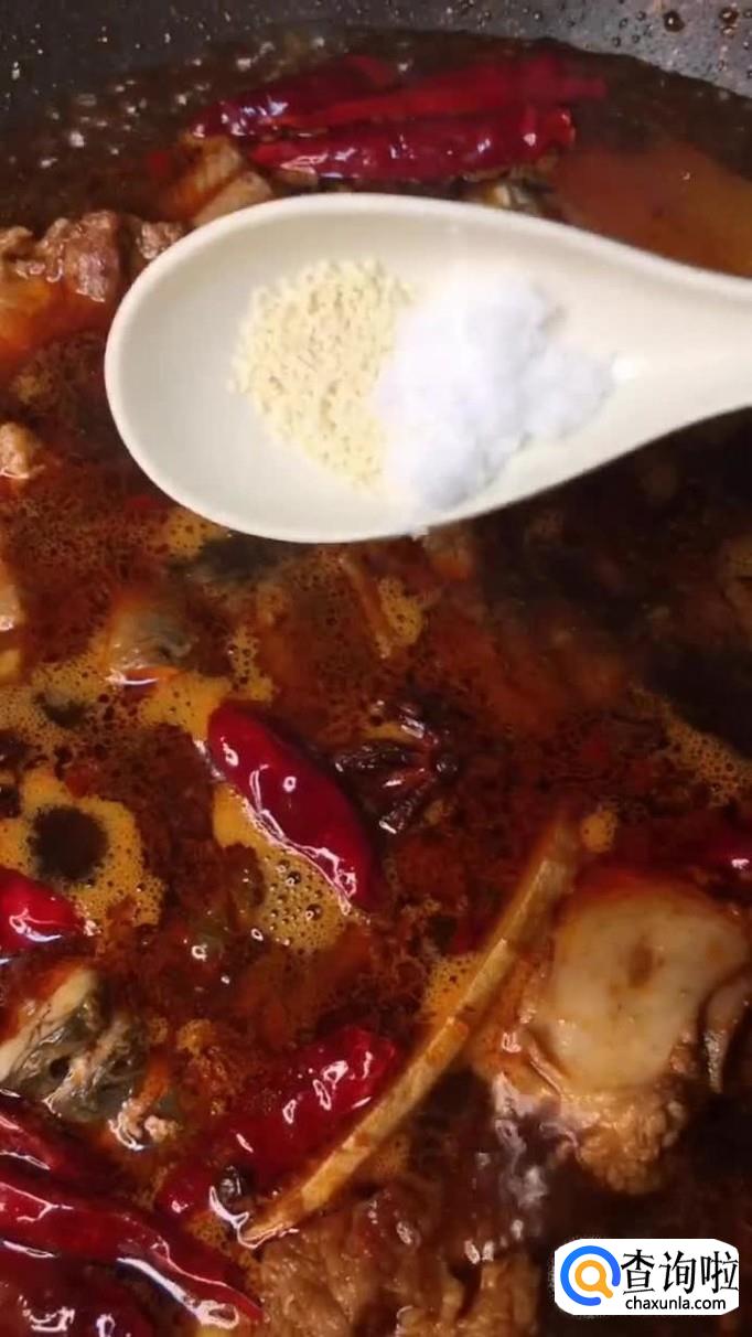 然后往锅中加入适量的盐巴和味精,开小火煮十分钟,如下图所示。