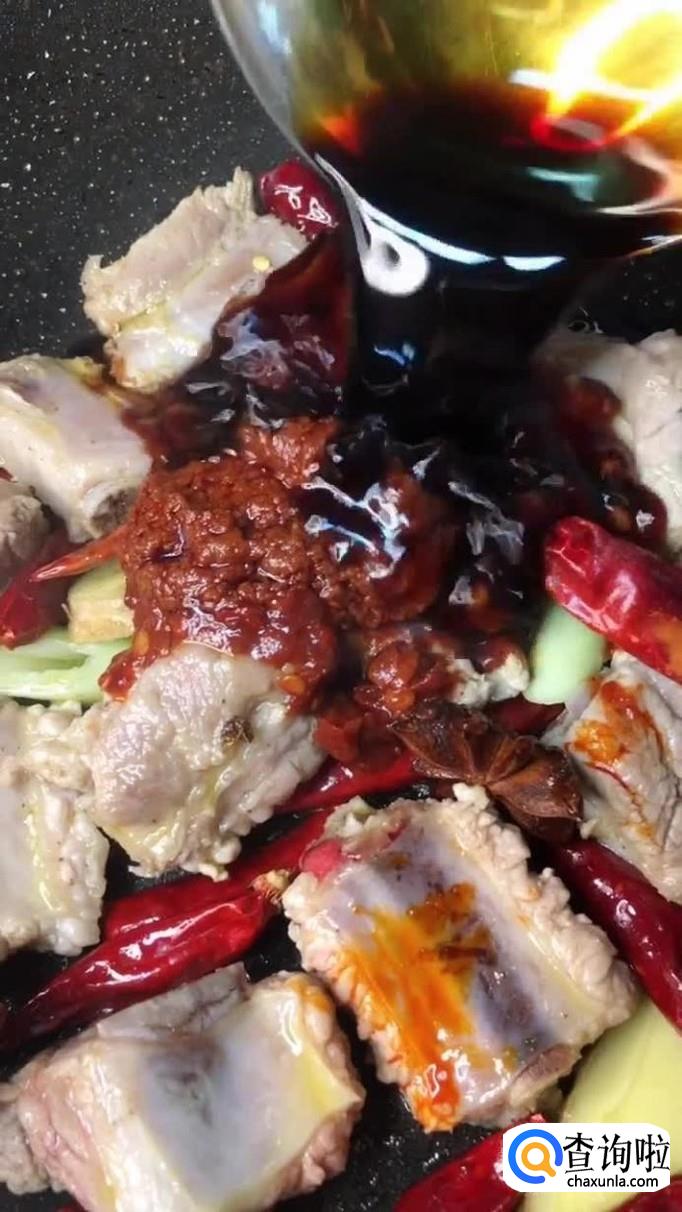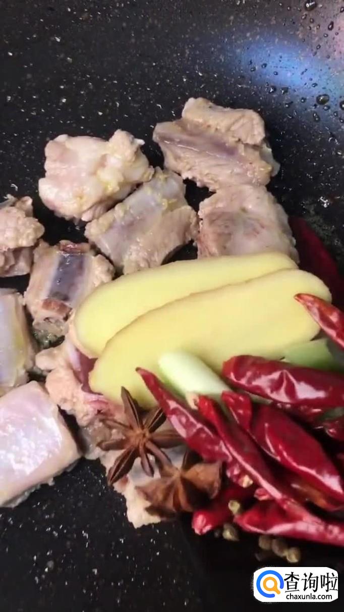 接着把排骨倒入锅中翻炒两分钟,加入适量的生姜、八角、干辣椒和大蒜,翻炒三分钟,如下图所示。