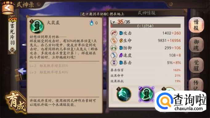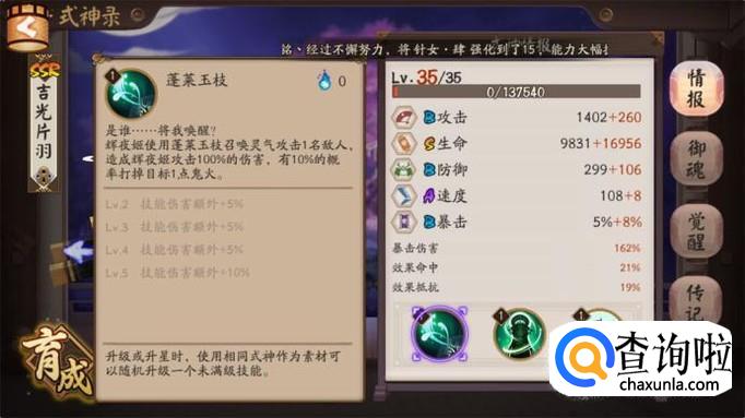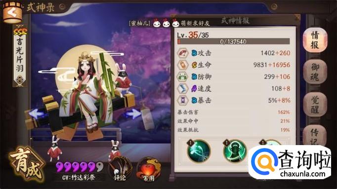 阴阳师中使用率最高的式神就是辉耀姬,作为SSR打火机我们先来看看这个式神的面板属性如何。虽然是SSR但是辉耀姬除了生命是S其他的属性速度攻击暴击防御都是A和B,但是这依然没有影响其作为SSR式神的地位。