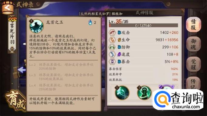 既然是最受欢迎的式神辉夜姬在实战中变现如何呢,首先看觉醒副本开局就是为队友增加防御和效果抵抗,而且辉夜姬和队友行动之前有概率获得鬼火,而且挨打也会获得鬼火,这就保证了队友可以无限放技能,非常实用。