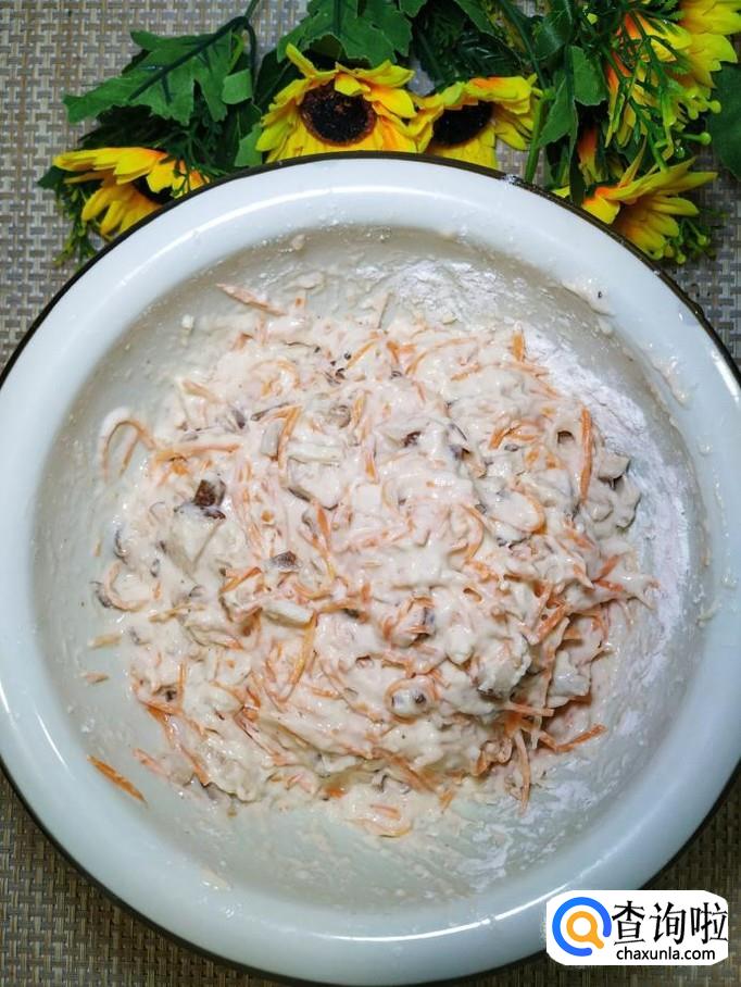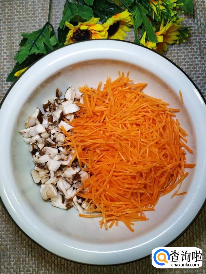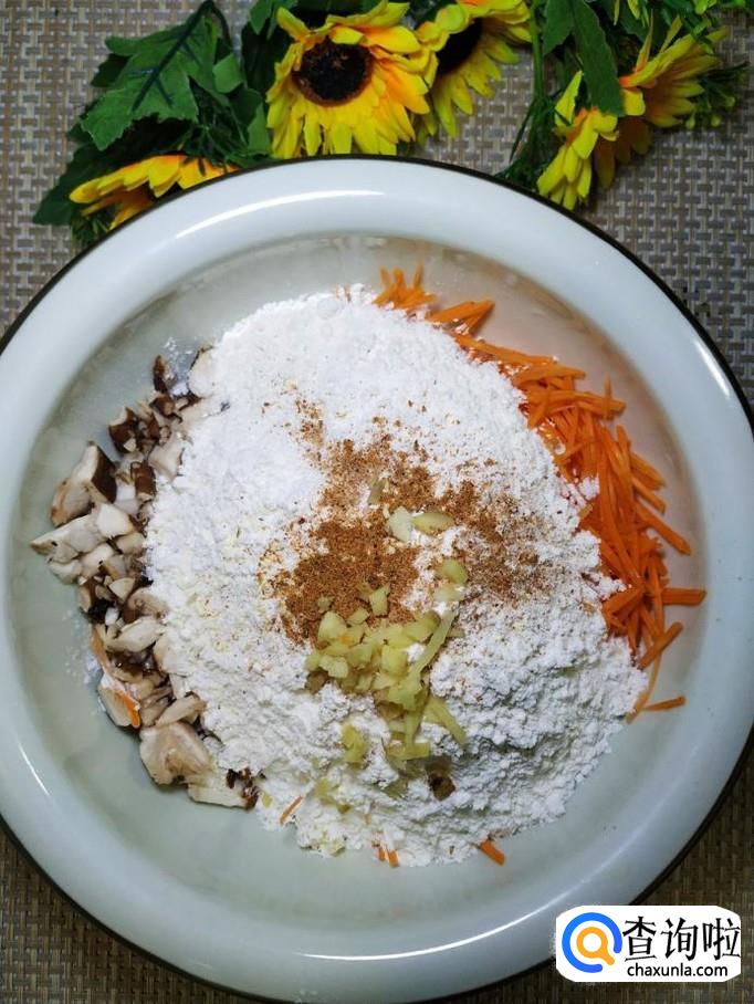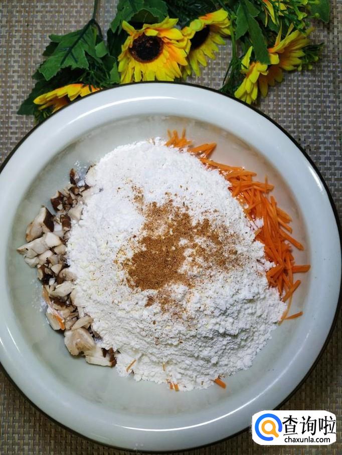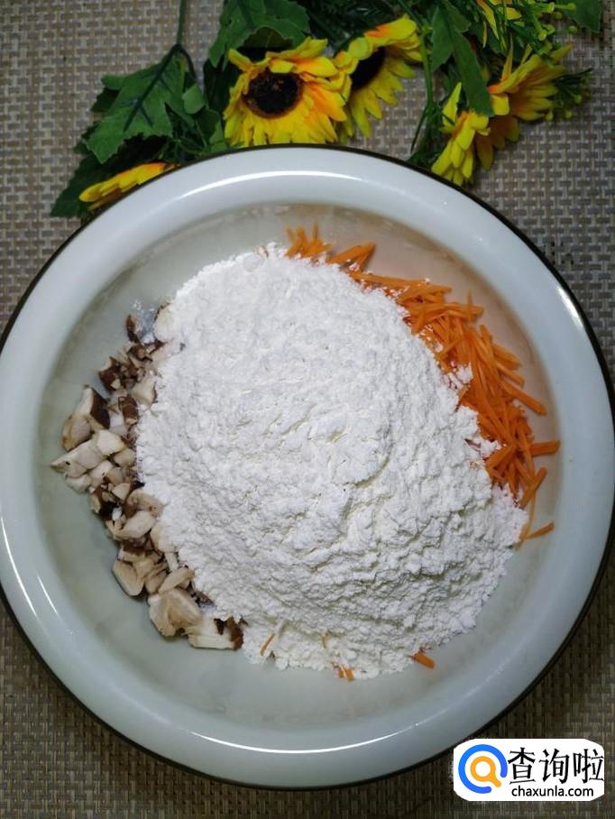 将香菇和胡萝卜丝放在一起,加入适量面粉。