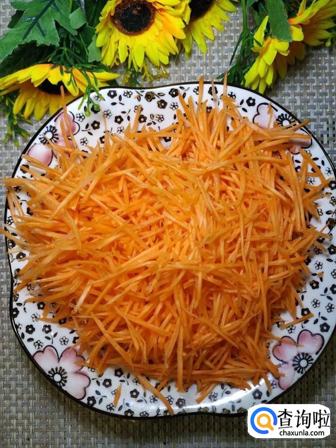 再准备适量胡萝卜,洗净去皮后,用擦板擦成丝,放入盘中备用。