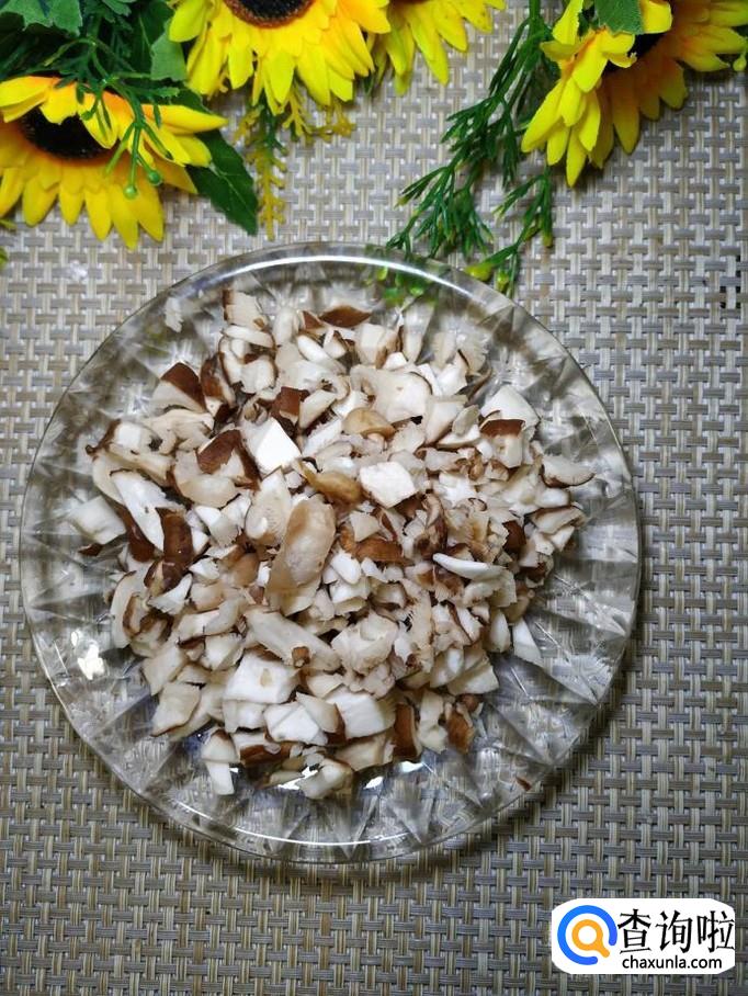 准备适量的香菇,洗净后切碎,放入盘中备用,如果是干香菇的话,需要泡发后再切碎。