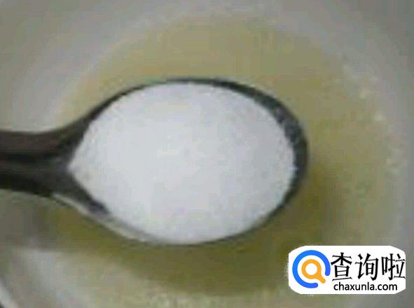 拿起打蛋器用力顺时针方向打,打到颜色发白,全是沫沫的时候,再加一勺白糖,半勺子盐。