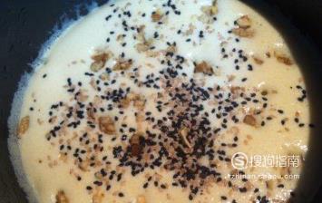 这时候可以根据自己的需要可以加上喜欢吃的东西哦,我这里加的核桃和葡萄干‘搅拌面粉的时候一起加也可以,上锅之后加会浮在表面,而搅拌的时候加会沉到底下。