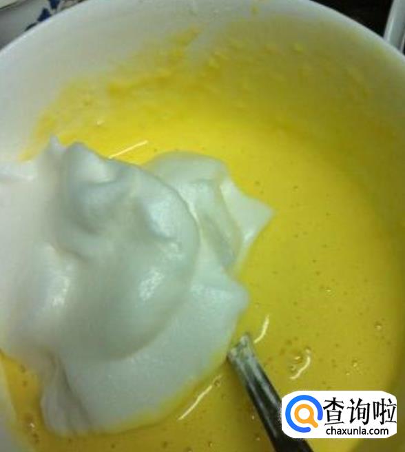 然后在蛋黄糊的碗里加入打好的蛋清。注意:不要一次加入,要分两次或三次加入,搅拌均匀。还要注意的是,搅拌的时候,不要像打发蛋清一样顺时针搅拌。
