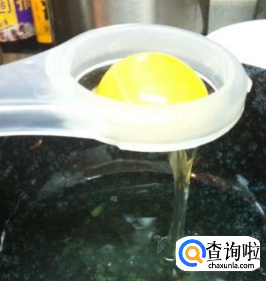 之一:把蛋壳敲成两半,注意不要弄散蛋黄,然后把蛋黄从左蛋壳移到右蛋壳,来回几次就可以分离了。