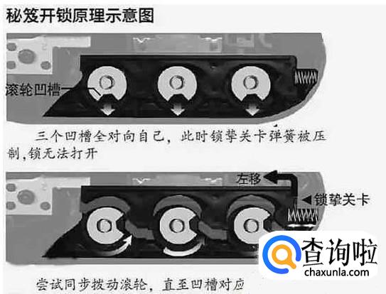 然后转动其中的一个密码按钮,我们会看见里面会有一个小槽(缺口),然后就停止转动,接下来转动另外两个密码按钮,直到这三个小槽对准同一个方向。