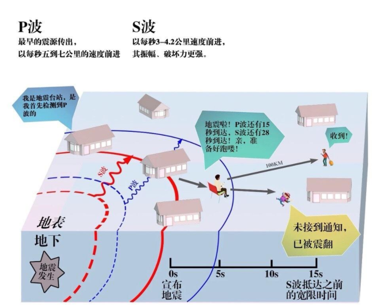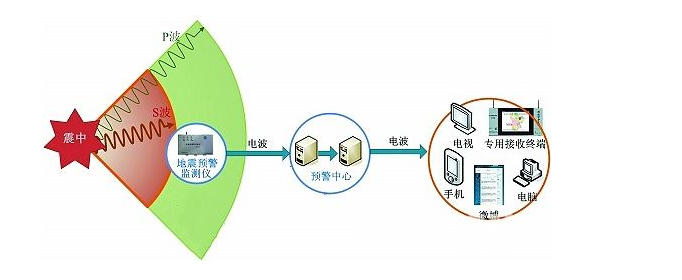 地震预警就是在地震发生后,人们利用地震波传播速度(4公里/秒)小于电波传播速度(30公/秒里)的特点,通过电波对地震波还未传播到的地方进行提前的警告。