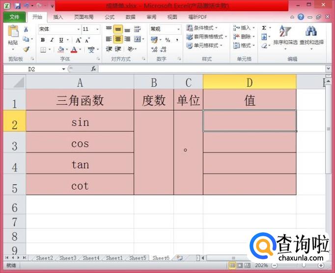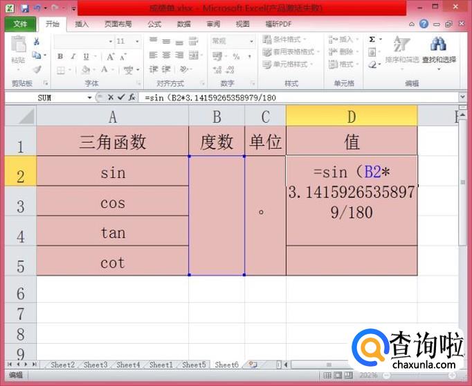 在D2单元格内输入”=sin(B2*3.14159265358979/180)“,按下”enter“键即可