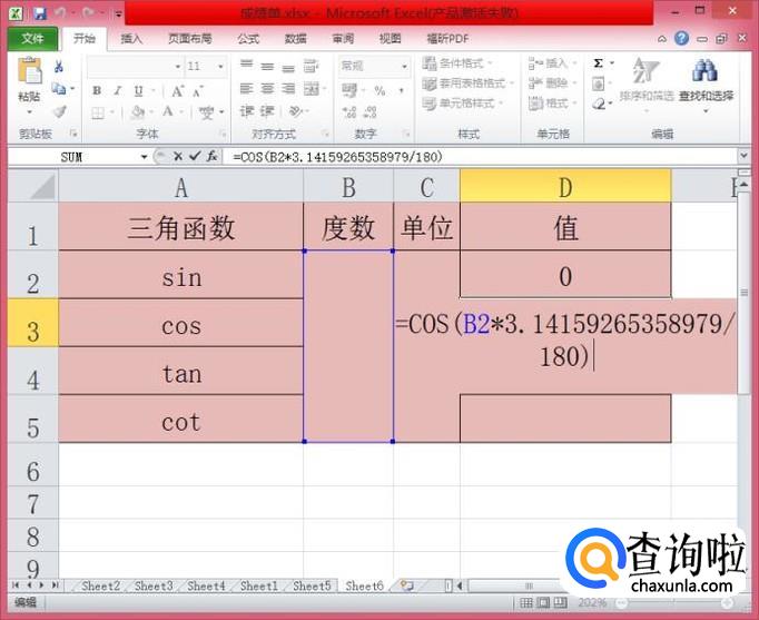 在D3单元格内输入”=cos(B2*3.14159265358979/180)“,按下”enter“键即可
