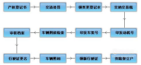 之后的流程表就是选号,拿新的车牌、新的行驶本、登记证书,以及提车。