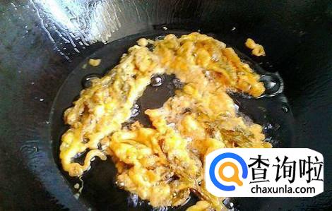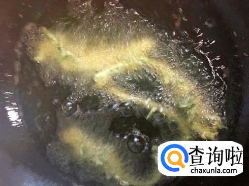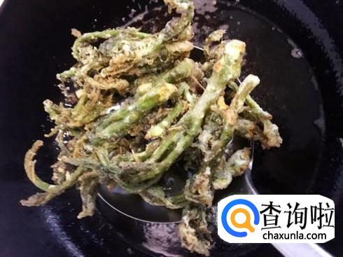 然后再将裹满面糊的香椿芽放入油锅之中,小火慢炸即可。