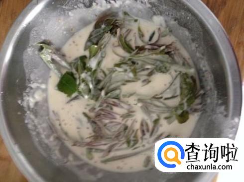 锅中加入适量植物油,烧热。将腌制好的香椿芽放入搅拌均匀的面糊中,使面糊将香椿芽裹均匀。