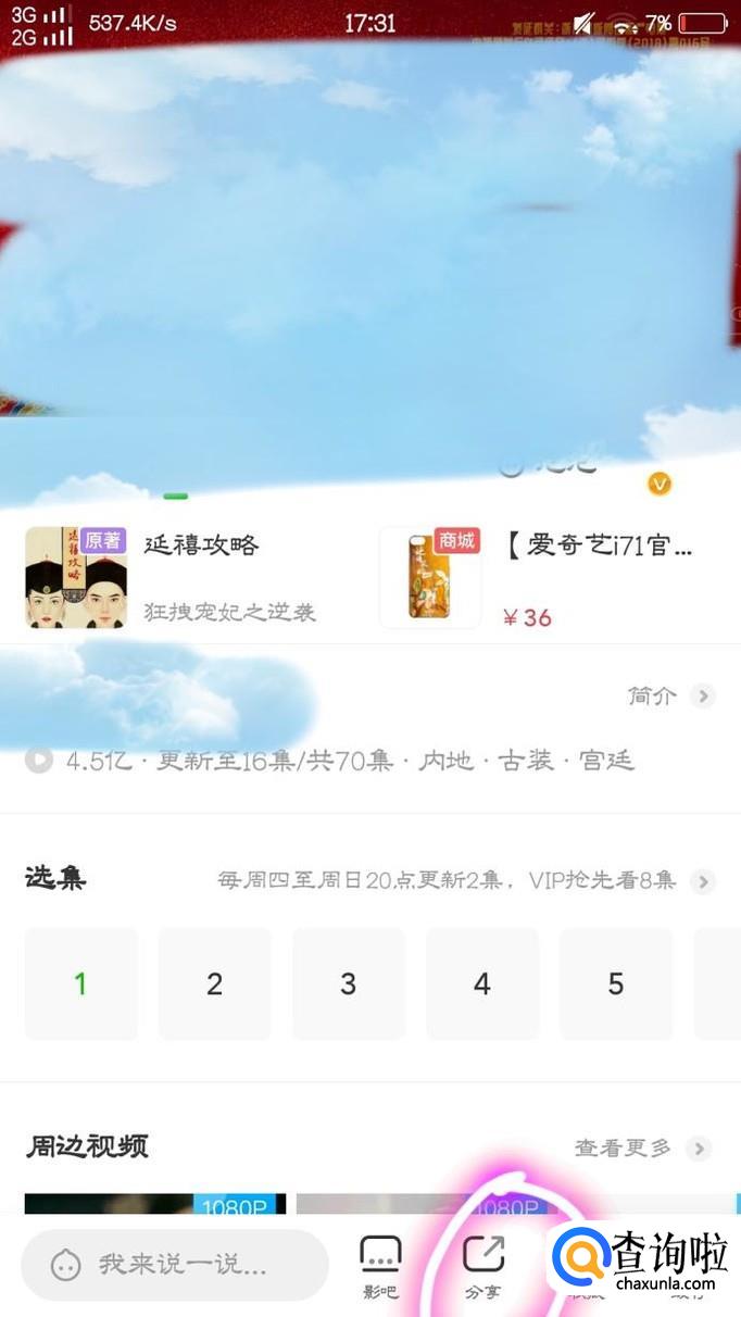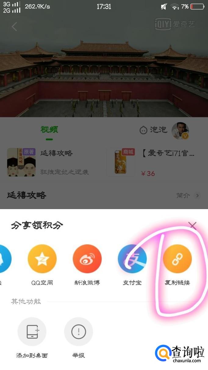 接下来,找到自己想看的电影或电视剧,来到该页面后,点击屏幕下方的“分享”点击后,往屏幕右方滑动,有个“复制链接”我们点击复制该视频的链接