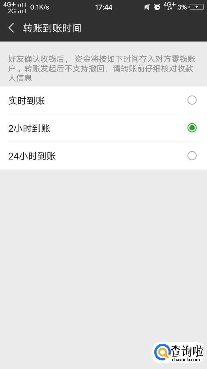 最后,点击转账到账时间,再点击“2小时到账”即可。