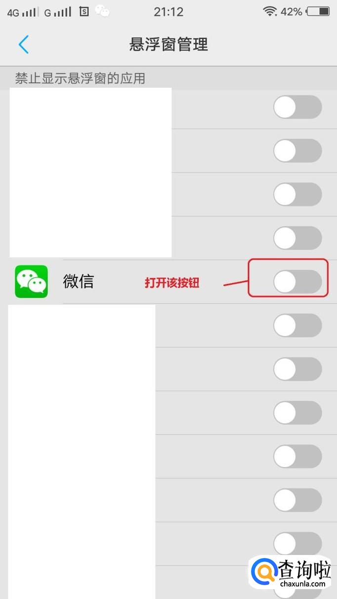 然后,我们找到微信,把代表悬浮窗管理的按钮打开,就可以了。