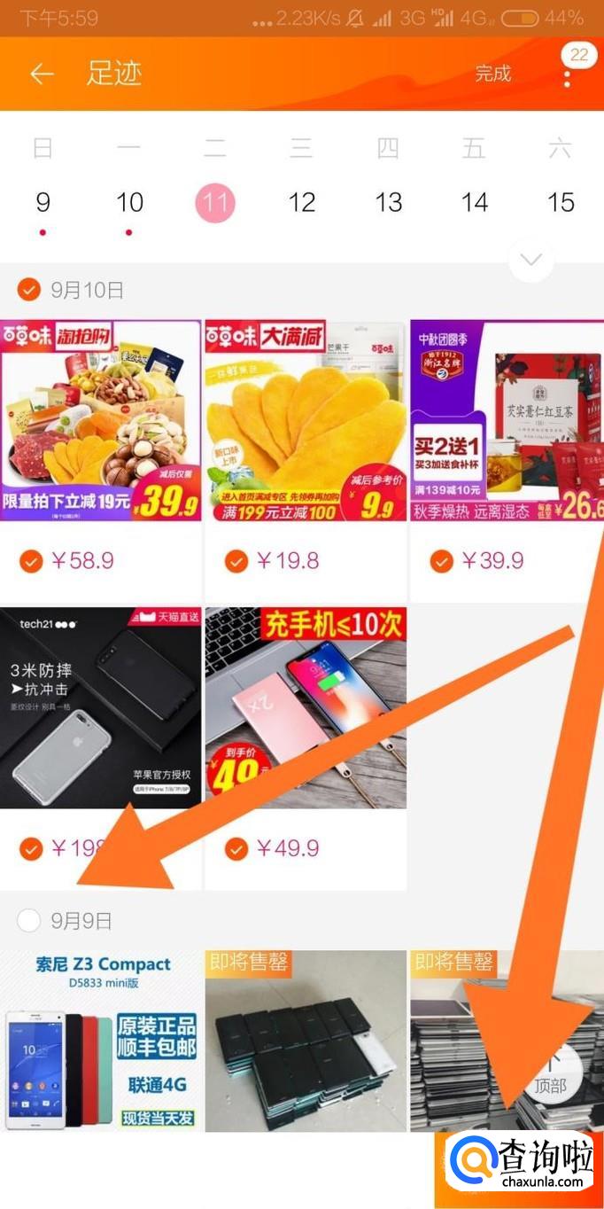 接着勾选需要删除的商品,点击下方“删除”字样即可删除足迹记录。