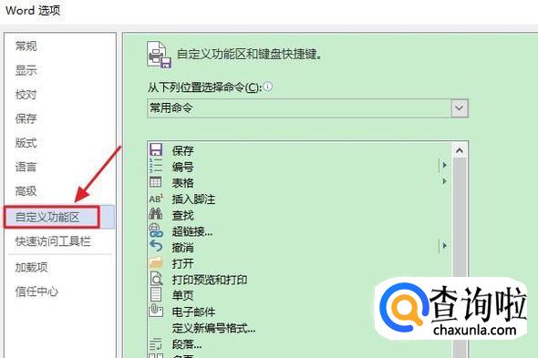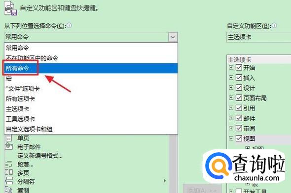 接着会弹出“Word选项”对话框,我们点击其中的“自定义功能区”,如图一;接着在右侧的命令里将默认的“常用命令”改为“所有命令”