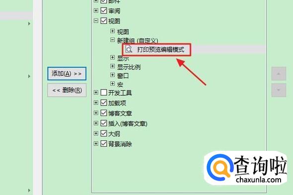 紧接着我们将刚才命令里的“打印预览编辑模式”添加到此新建组里,点击确定以后返回到刚才的文档编辑页;