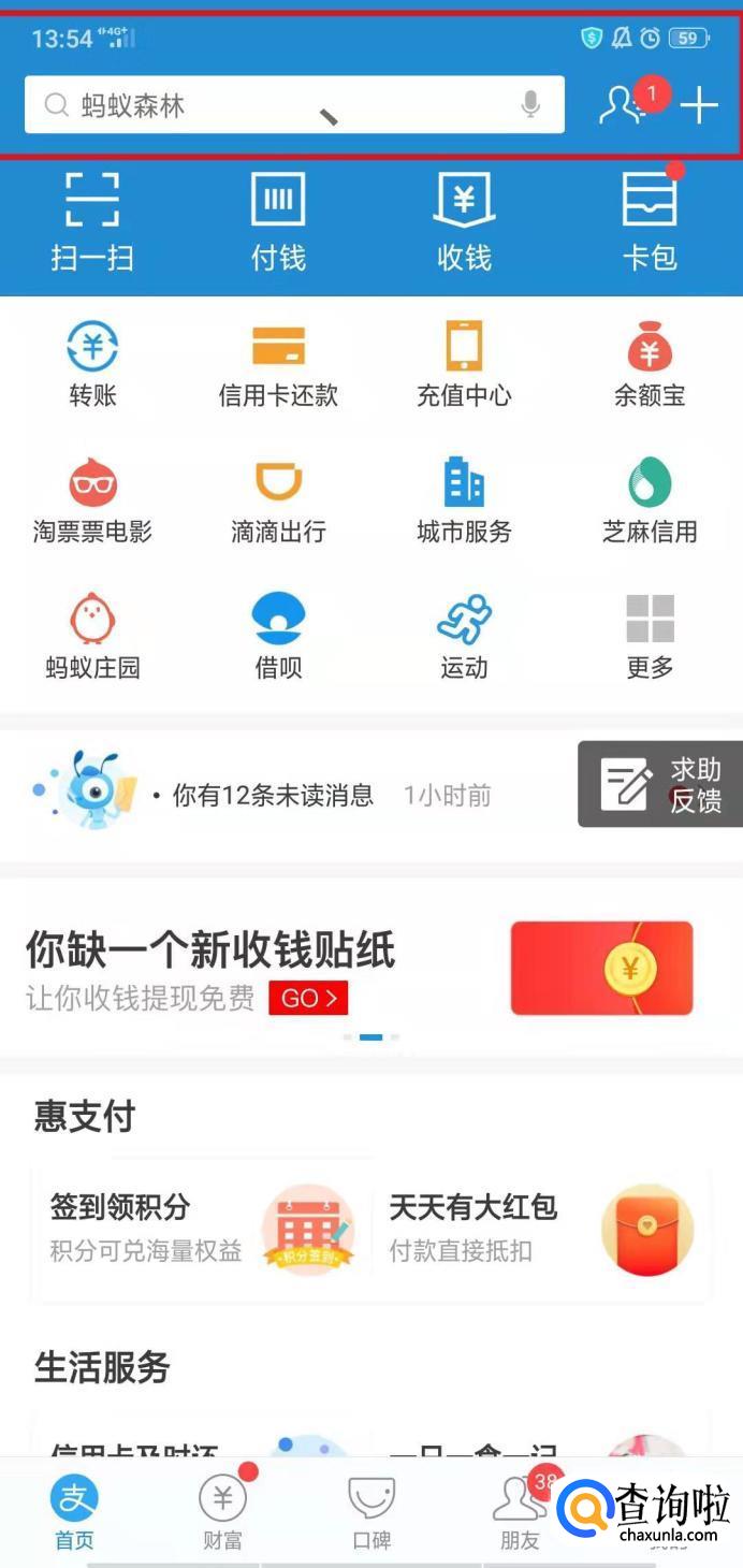 进入支付宝首页,找到支付宝搜索栏。