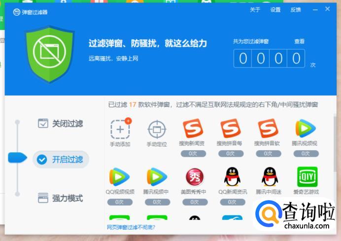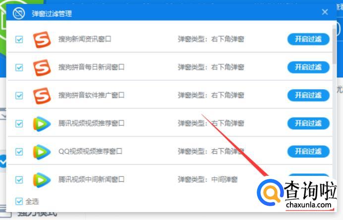 接着通过点击手动添加来添加阻止弹窗的程序,通过点击开启过滤或者通过选择全选,如下图所示: