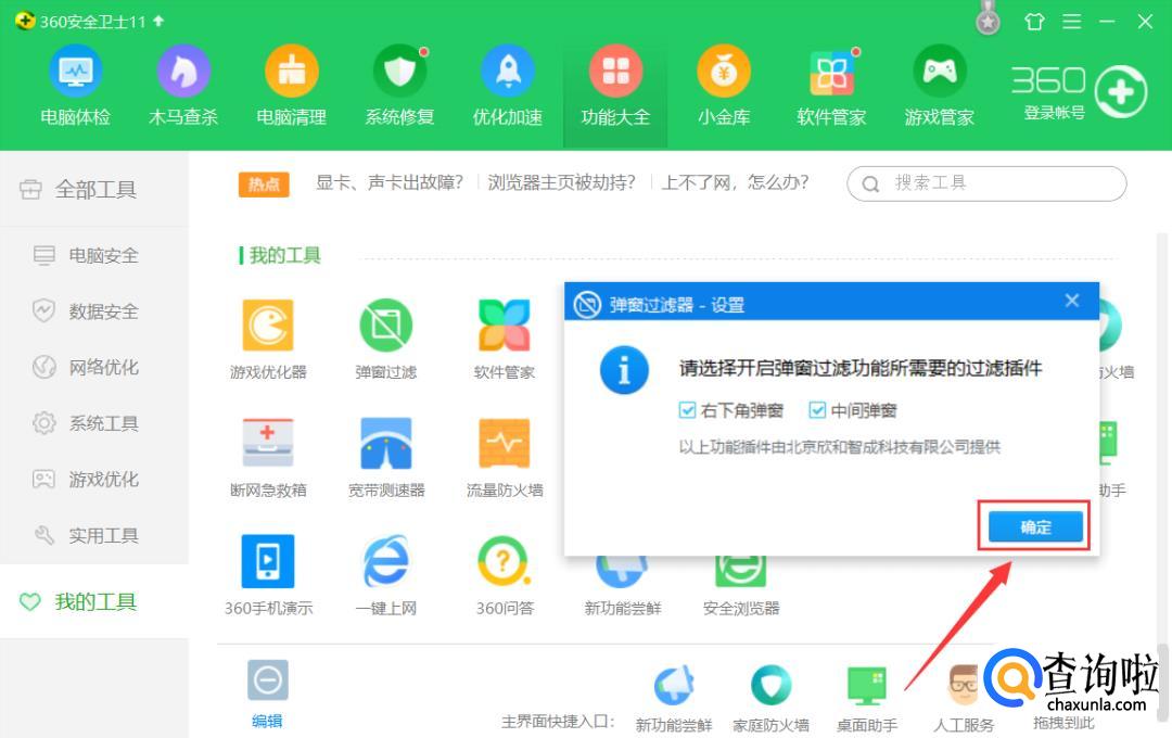 然后点“我的工具”,我的工具页面里点击“弹窗过滤”,如下图: