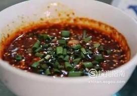 准备一个碗,往碗中放入刚才切好的葱、姜、蒜,再加入辣椒油、香油、醋、酱油、盐,调成一碗酱汁。