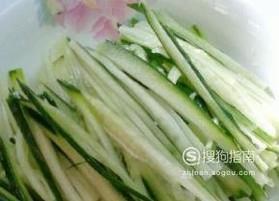 先切一些黄瓜丝备用,如果黄瓜太老就把皮刮掉再切。